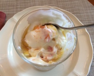 Mid-eat top-down view of half-eaten yogurt parfait.